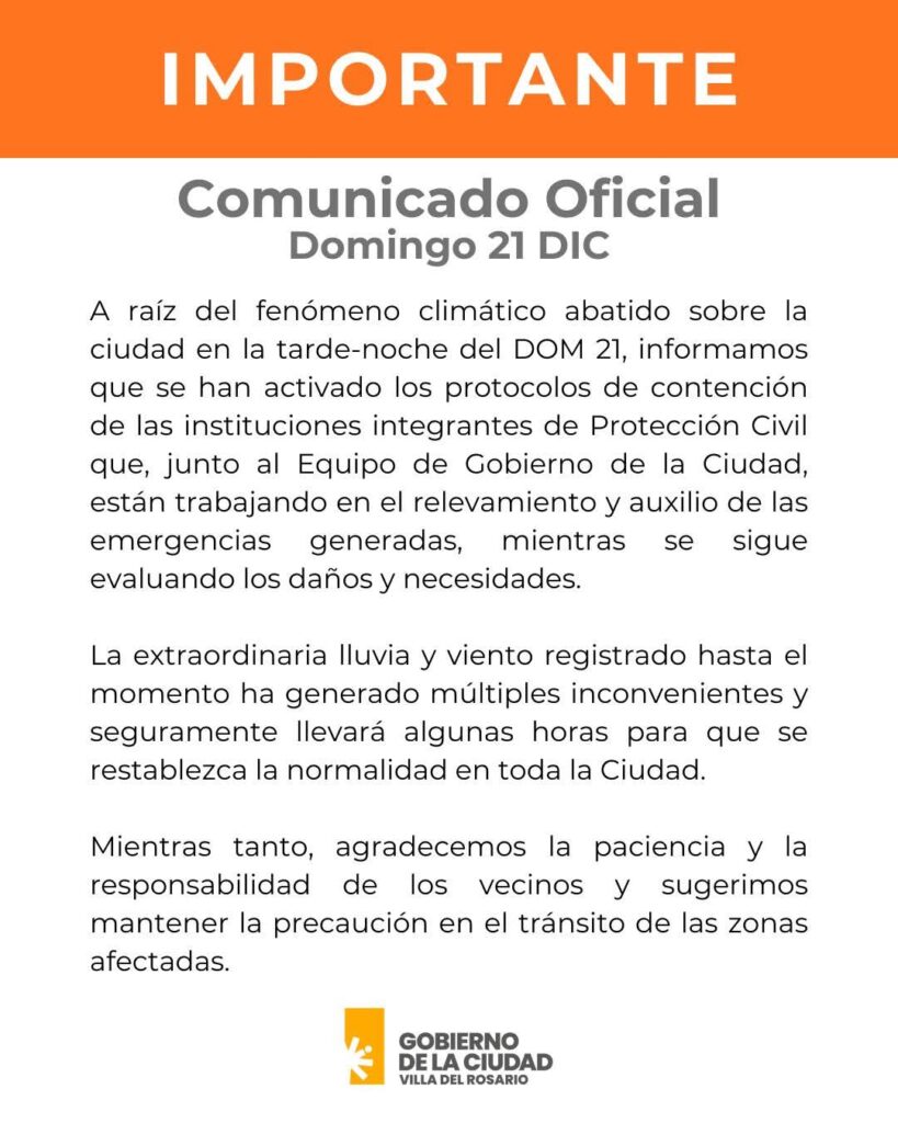 El fenómeno climático se caracterizó por intensas ráfagas de viento del sector oeste, abundante caída de lluvia y granizo, lo que derivó en el anegamiento de calles, la caída de árboles y postes y cortes generalizados del suministro eléctrico en distintos sectores de la ciudad.Ante esta situación, el Gobierno de la Ciudad de Villa del Rosario informó mediante un comunicado oficial que se activaron los protocolos de emergencia, con la intervención de Protección Civil y el Equipo de Gobierno, que trabajan en el relevamiento de daños y la asistencia a las emergencias registradas.