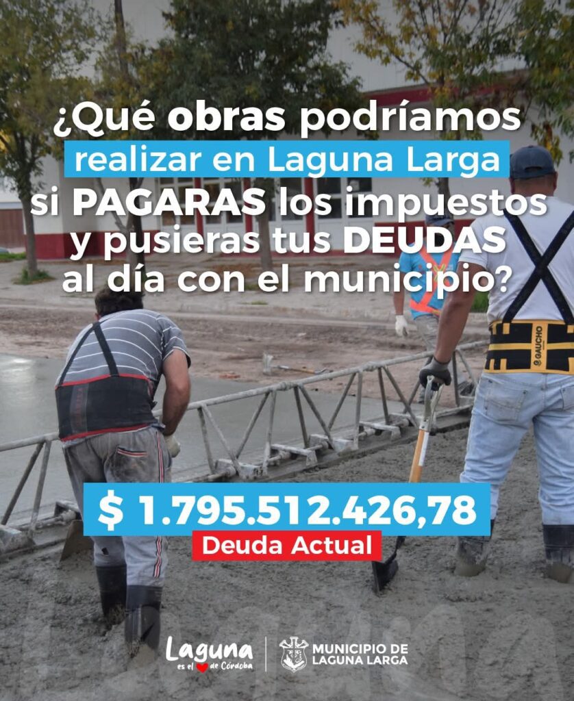 LAGUNA LARGA – El municipio expuso con crudeza una realidad que impacta de lleno en la vida cotidiana de la ciudad. A través de una campaña en redes sociales, el intendente Matías Torres Cena puso en números y en obras concretas la deuda que mantienen los vecinos con el municipio: $1.795.512.426,78 en impuestos impagos.