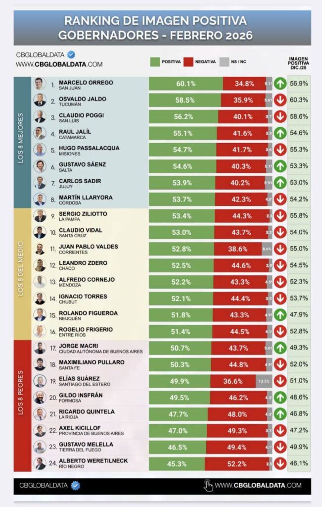 El ranking general de febrero es encabezado por Marcelo Orrego (San Juan), con 60,1% de imagen positiva, seguido por Osvaldo Jaldo (Tucumán) con 58,5%, y Claudio Poggi (San Luis) con 56,2%.En el extremo inferior del listado aparecen Alberto Weretilneck (Río Negro), Gustavo Melella (Tierra del Fuego) y Axel Kicillof (Buenos Aires), quienes registran los niveles más bajos de aprobación del mes.