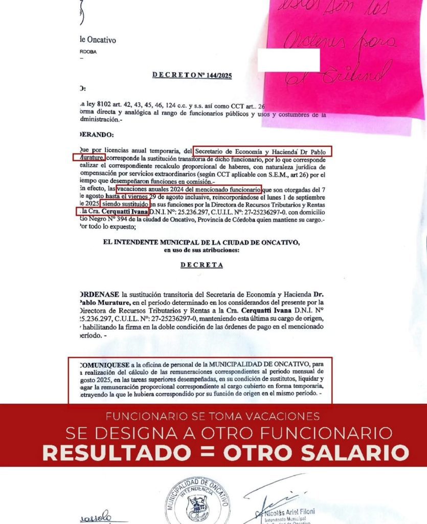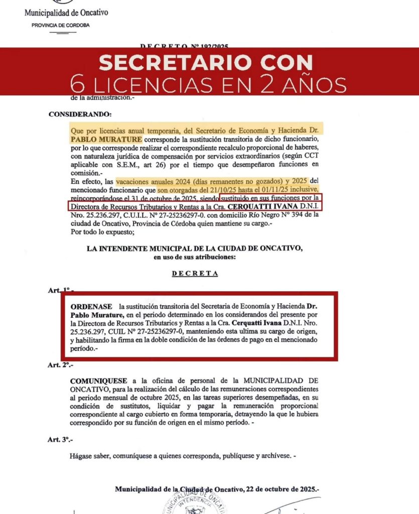 El punto que genera controversia es que esa sustitución implicó el correspondiente recalculo y liquidación de haberes por funciones superiores, lo que —según remarcan desde la oposición— representa un costo adicional para el municipio.Los números en debate