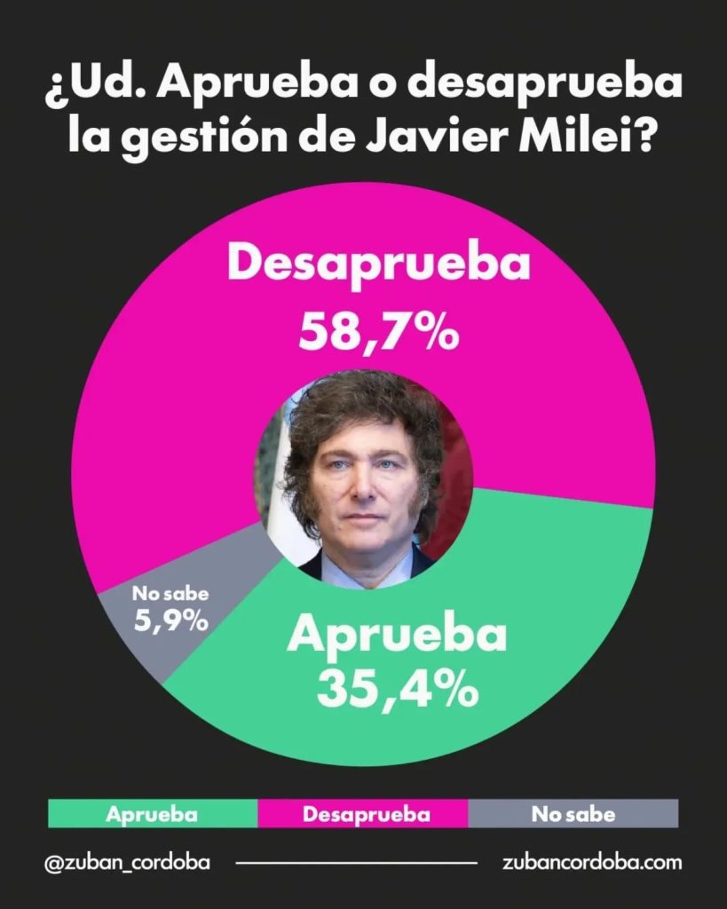 ENCUESTA ZUBAN CÓRDOBA: LA DESAPROBACIÓN DE MILEI TREPA AL 58,7% Y VUELVE A AMPLIAR LA DISTANCIA SOBRE LA APROBACIÓN