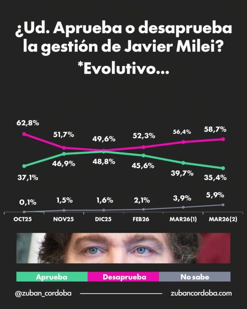 El dato cobra mayor relevancia al observar la serie histórica que la propia consultora difundió junto al informe. En octubre de 2025, en el marco de las elecciones legislativas, la gestión había alcanzado un piso de desaprobación del 62,8% y una aprobación de apenas el 37,1%. Tras el triunfo de La Libertad Avanza en esos comicios, los números mostraron una recuperación marcada: en noviembre la aprobación trepó al 46,9% y la desaprobación cayó al 51,7%, y en diciembre ambas cifras se empataron en torno al 49%. Sin embargo, desde febrero de 2026 la tendencia se revirtió nuevamente. En ese mes la desaprobación volvió a superar el 52%, y en las dos mediciones de marzo el rechazo escaló primero al 56,4% y luego al 58,7% actual.